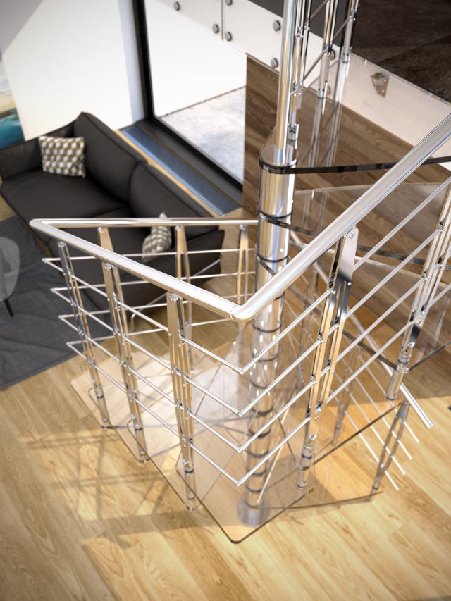 La scala a chiocciola in acciaio e vetro è composta da gradini in vetro temperato e stratificato, disponibili in due finiture (chiaro o extra chiaro).