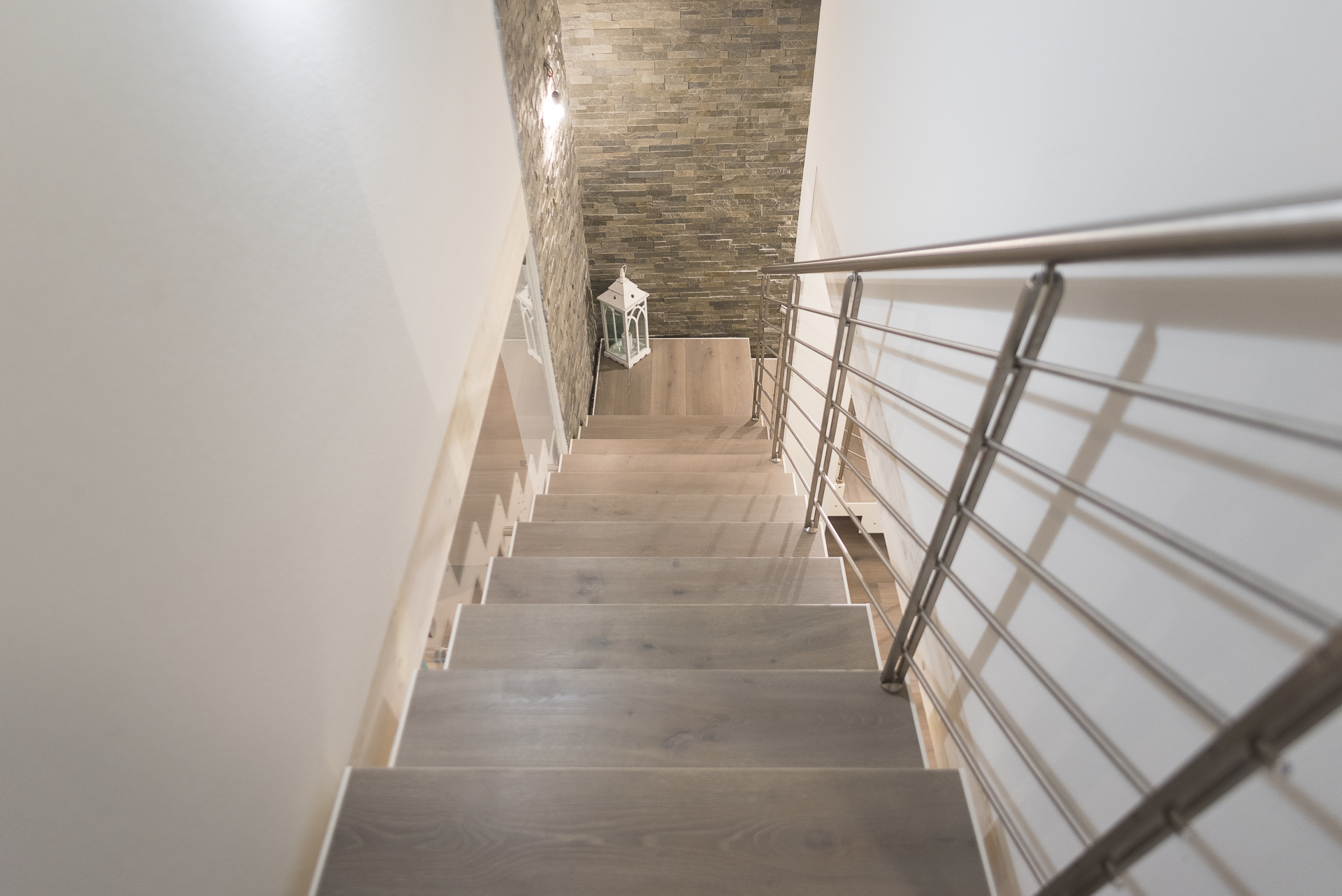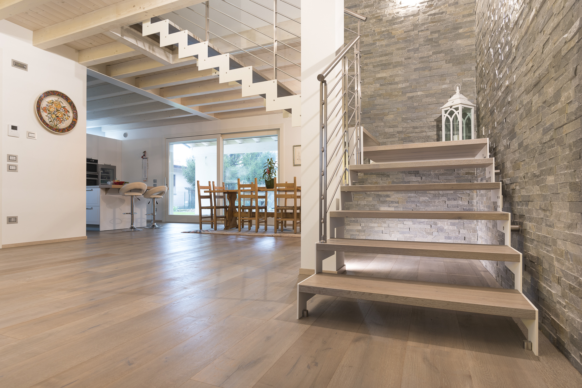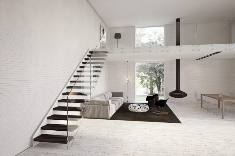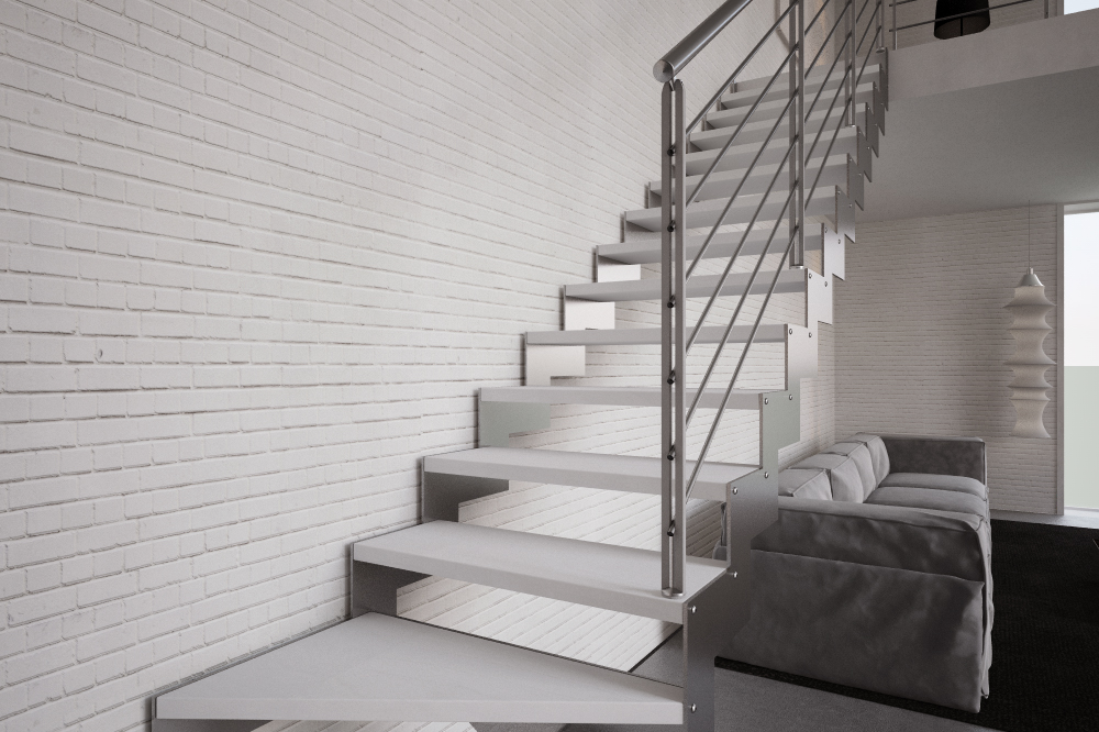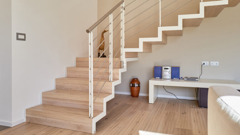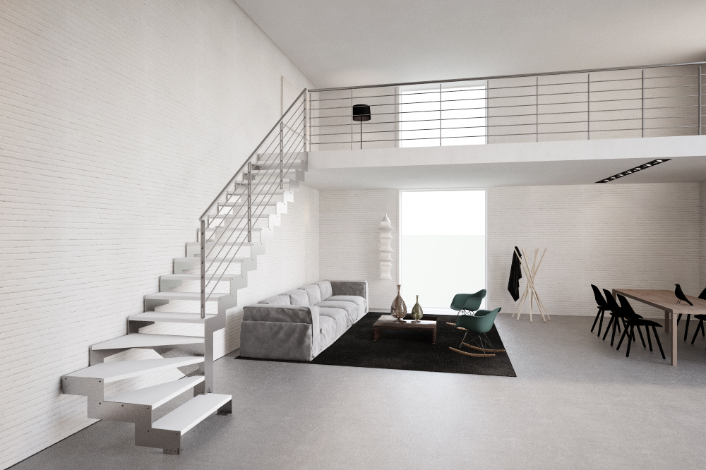 L’abbinamento con ringhiere in acciaio o vetro e gli scalini privi di alzata garantiscono la diffusione ottimale della luce ambiente e l’utilizzo di tinte neutre la rendono una scala minimal e sobria.