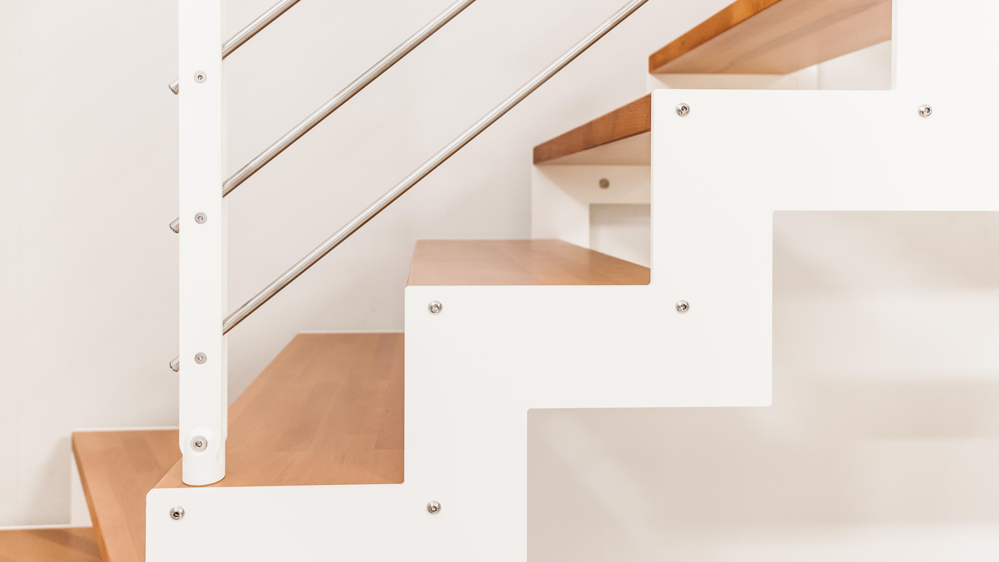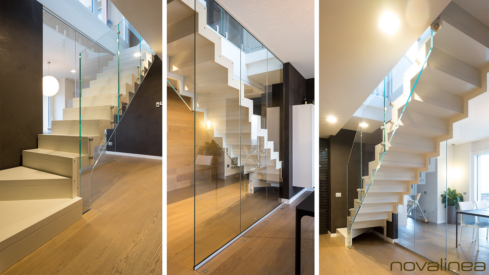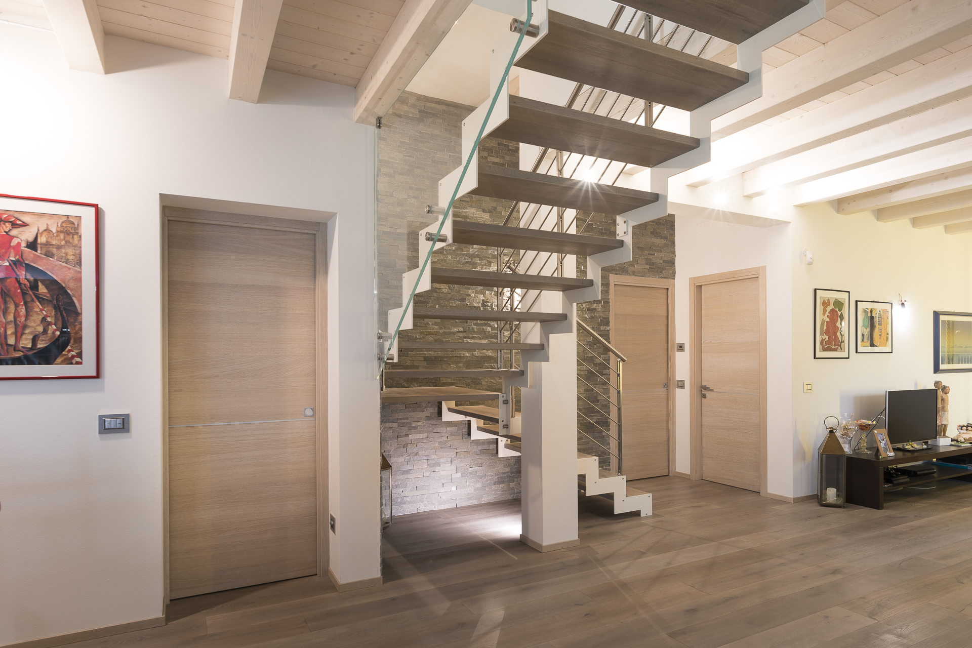L’abbinamento con ringhiere in acciaio o vetro e gli scalini privi di alzata garantiscono la diffusione ottimale della luce ambiente e l’utilizzo di tinte neutre la rendono una scala minimal e sobria.
