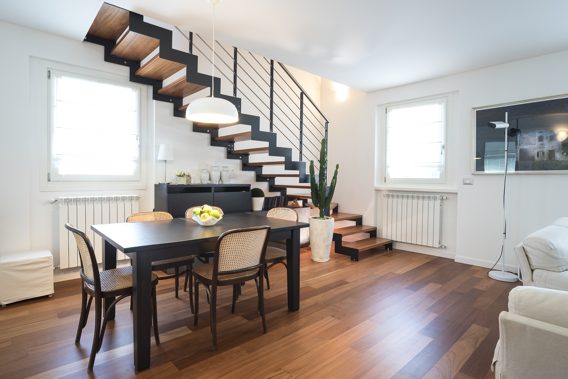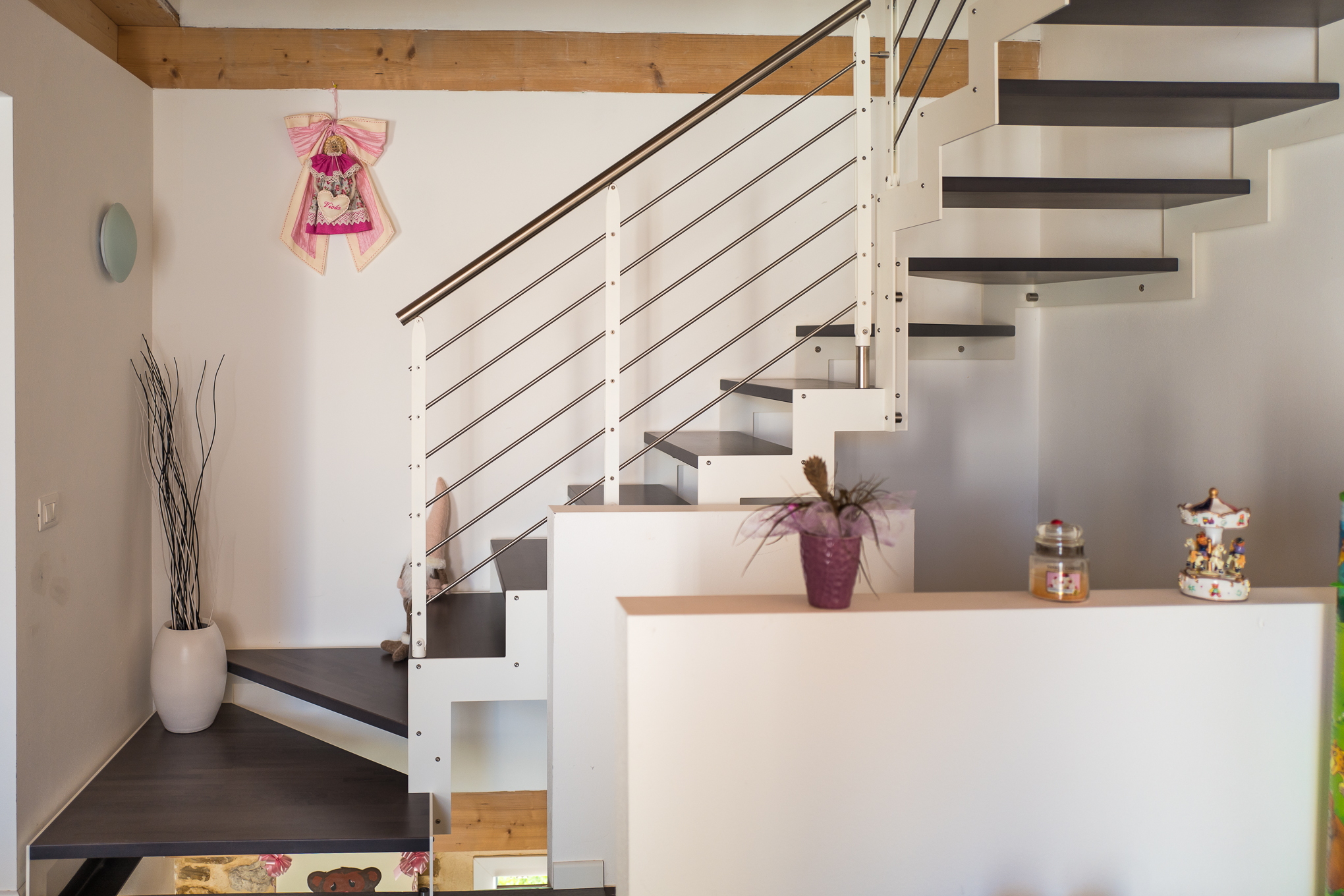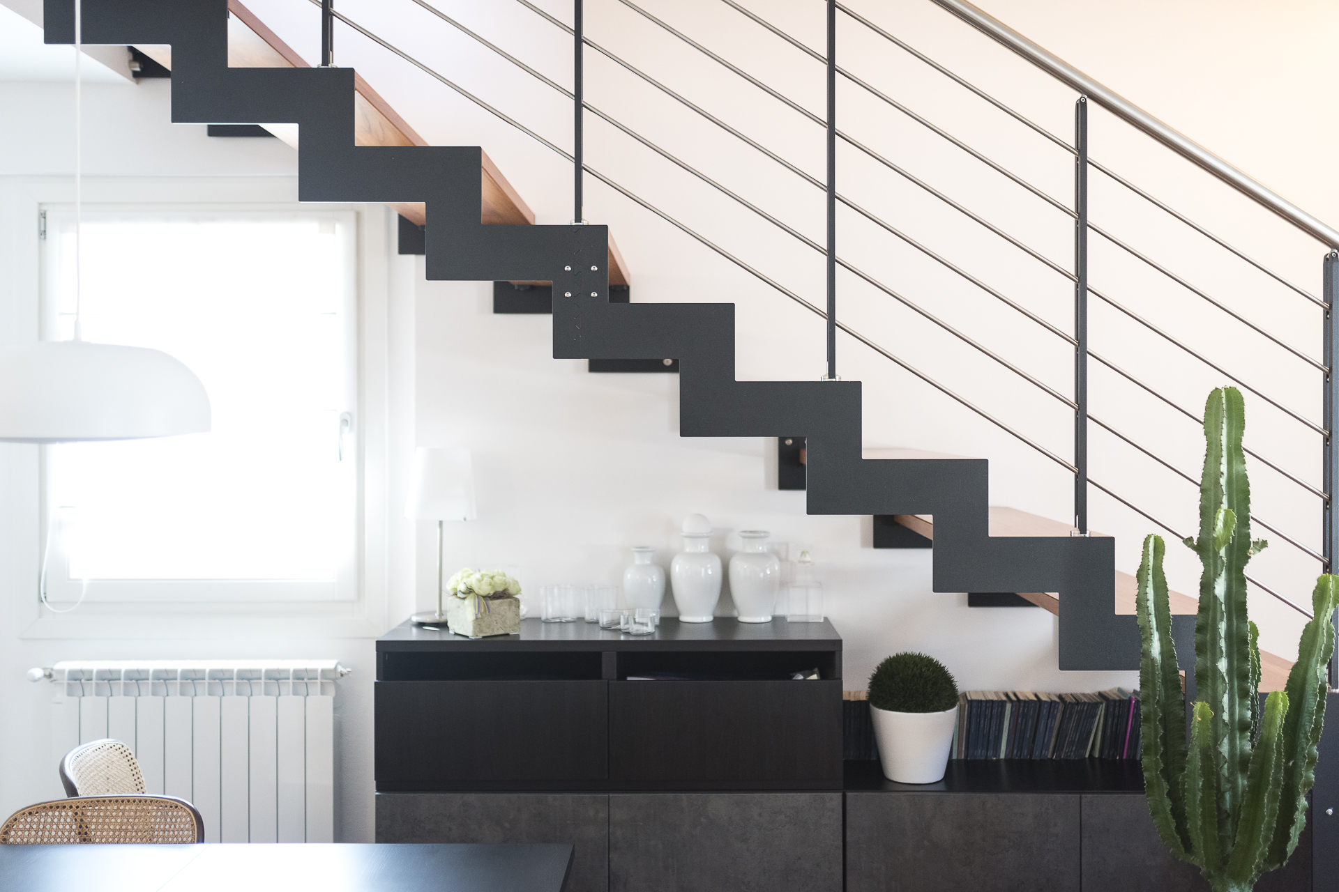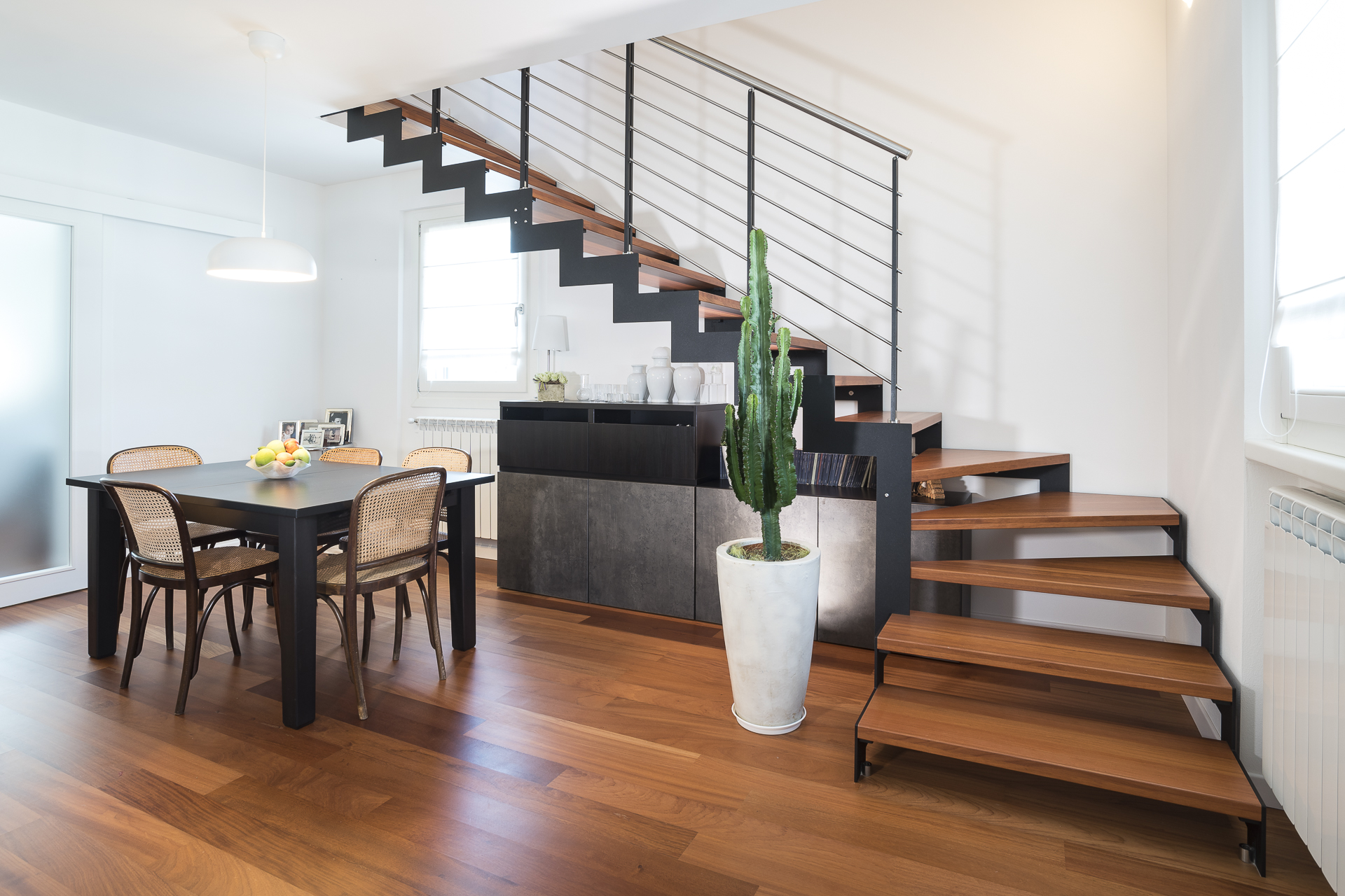 L’abbinamento con ringhiere in acciaio o vetro e gli scalini privi di alzata garantiscono la diffusione ottimale della luce ambiente e l’utilizzo di tinte neutre la rendono una scala minimal e sobria.