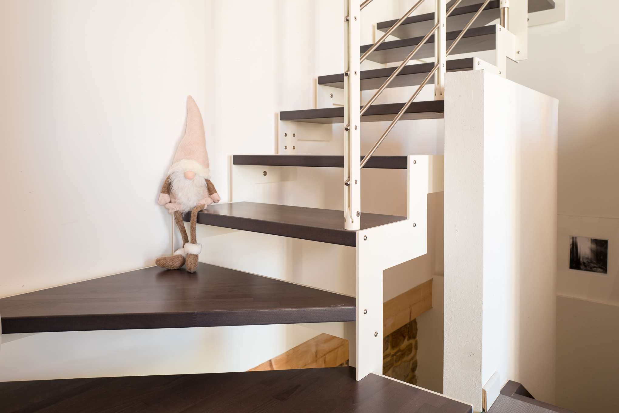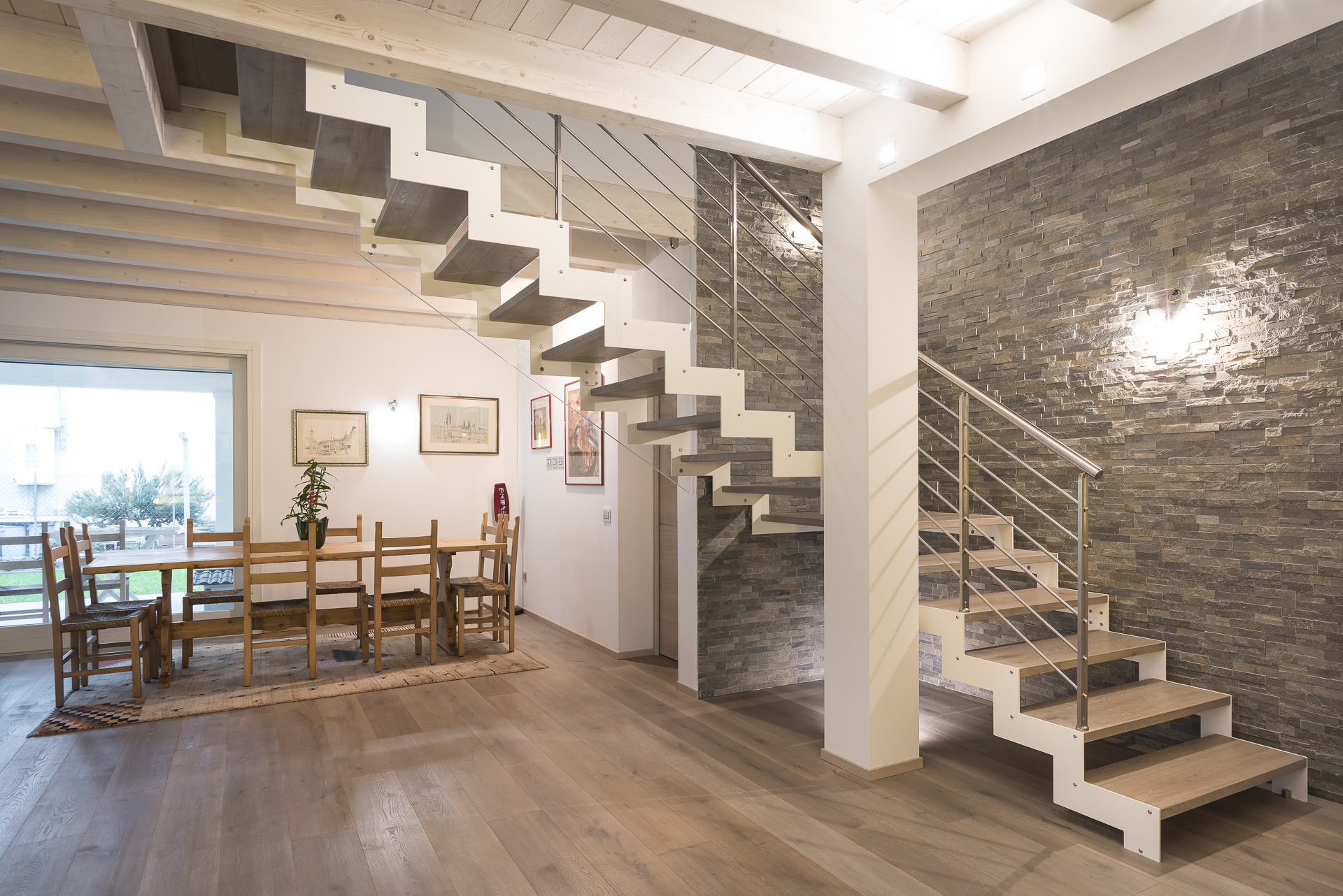 L’abbinamento con ringhiere in acciaio o vetro e gli scalini privi di alzata garantiscono la diffusione ottimale della luce ambiente e l’utilizzo di tinte neutre la rendono una scala minimal e sobria.