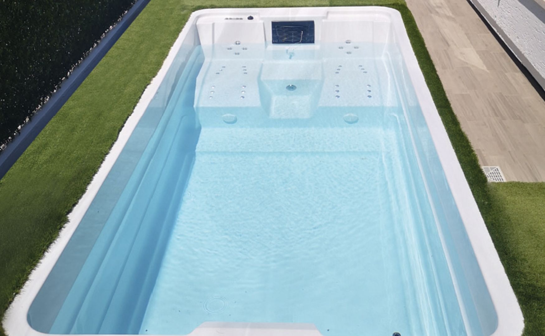 La configurazione interna è pensata per un utilizzo versatile: due sedute idromassaggio permettono momenti di relax profondo, mentre le due chaise longue idromassaggio offrono un’esperienza distensiva totale, ideale per il recupero muscolare e il benessere quotidiano. Il sistema di nuoto controcorrente trasforma la vasca in uno spazio attivo, perfetto per l’allenamento, il movimento in acqua e la riabilitazione, senza rinunciare al comfort tipico di una spa.